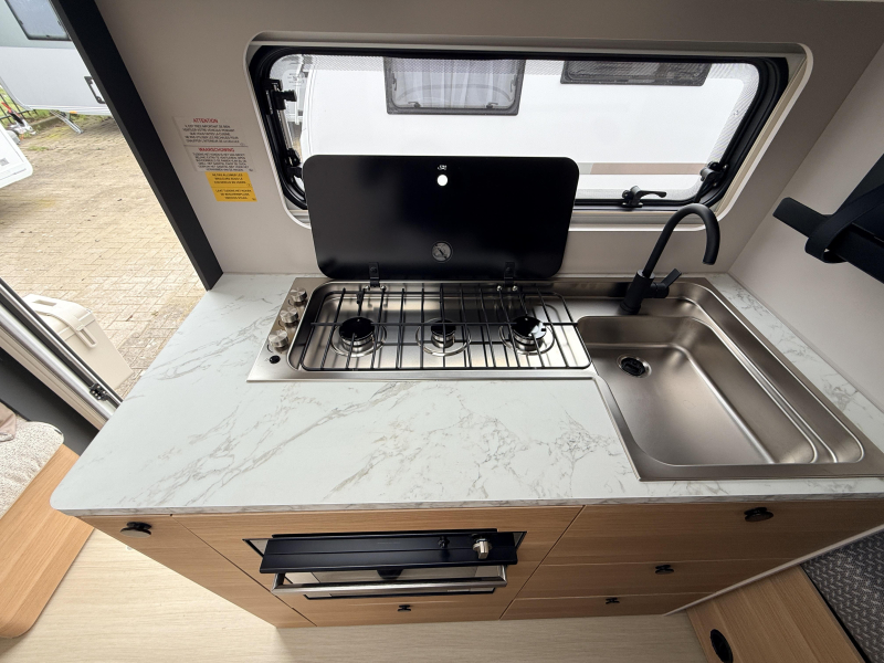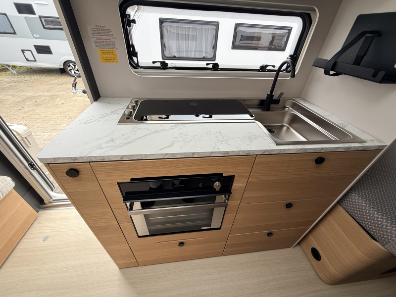 In de praktische rondzit waarmee de caravan is uitgerust, kunt u genieten van heerlijke maaltijden en gezellige avonden. De luxueuze keuken van deze Adria caravan is geheel compleet uitgevoerd, met bijvoorbeeld een oven, om verse broodjes te bakken en ovenschotels te bereiden. Een ingebouwde boiler voorziet u van warm water. Om al uw etenswaren op te bergen is er een extra ruime XL koelkast (150 liter) met vriescompartiment ingebouwd. De ladekast biedt u een fraaie bergplaats voor al uw keukenspulletjes.