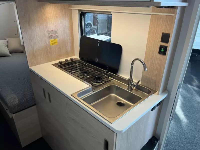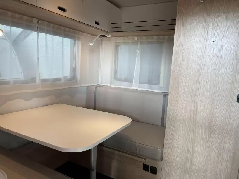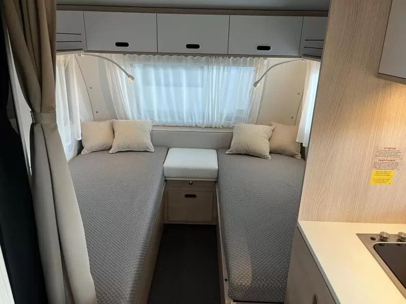 De standaardzit biedt niet alleen de nodige zitgelegenheid, maar kan ook worden omgebouwd tot slaapplaats. De caravan beschikt over een middenkeuken met voldoende bergruimte, die praktisch is ingericht en met een 3-pits kooktoestel, spoelbak en kraan is uitgevoerd. Voor een snelle toevoer van warm water is er een 5 liter boiler aanwezig. De koelkast (142 liter) met vriesvak biedt voldoende ruimte voor heel uw voorraad.