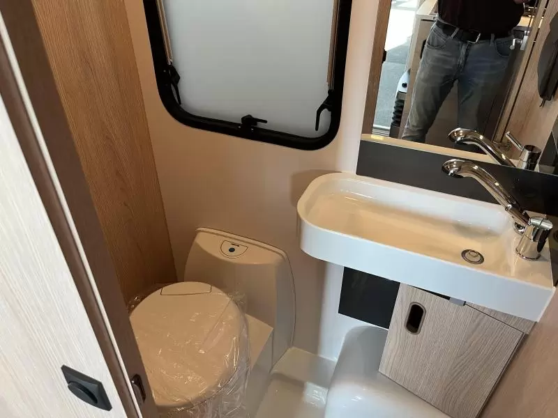 Slapen doet u op de 2 aparte bedden, die borg staan voor extra ruimte en een makkelijke instap. In de badkamer vindt u een wastafel om u op te frissen, alsmede een ingebouwd cassettetoilet. In de caravan kunt u ook douchen. Er bevindt zich een doucheruimte naast het slaapgedeelte.