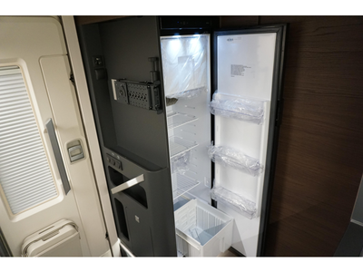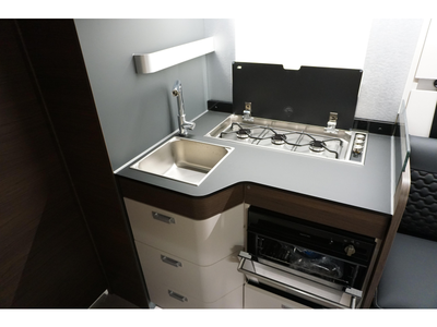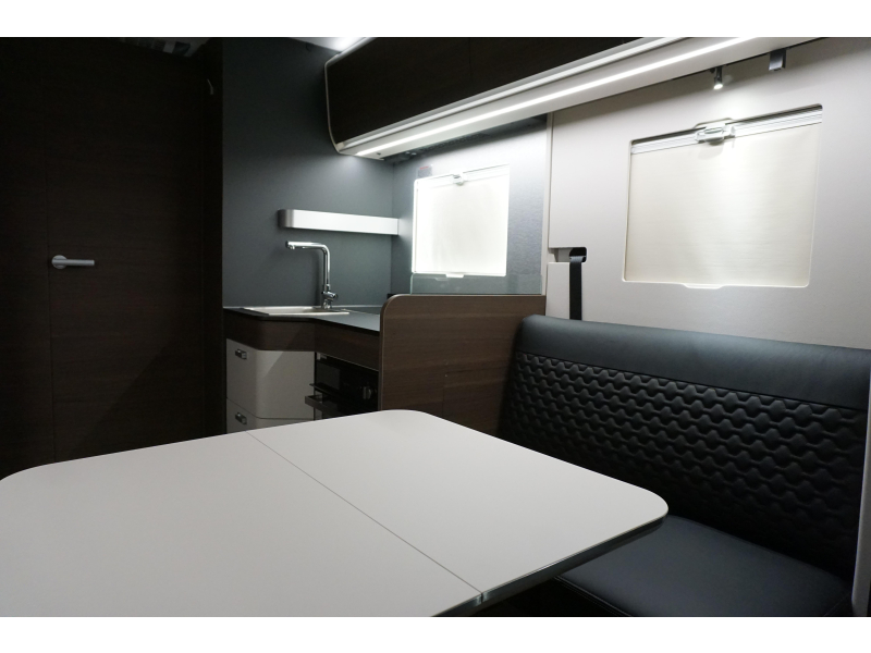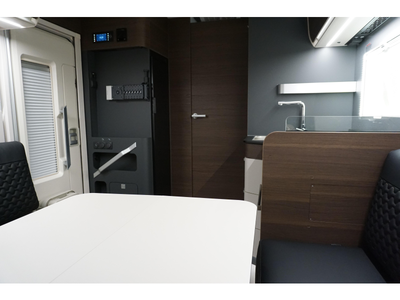 De uitnodigende middendinette is de ideale plek om samen te eten en te drinken. Het keukenblok is centraal in de camper gemonteerd en is onder anderen uitgerust met 3-pits gascomfoor, spoelbak en kraan. De 10 liter boiler, die in de camper is ingebouwd, voorziet u snel van warm water. De koelkast (142 liter) met vriescompartiment is ruim genoeg voor al uw etenswaren.