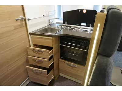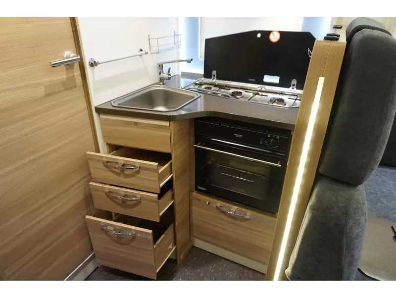De camper is voorzien van een handige L-zit voor een sfeervol samenzijn. Adria heeft de luxe uitgevoerde keuken van deze camper voorzien van een afzuigkap, voor de afvoer van kookluchtjes en overtollige warmte, en van een oven, zodat u s ochtends verse broodjes op tafel heeft. Voor een snelle toevoer van warm water is er een 10 liter boiler aanwezig. Om al uw etenswaren op te bergen is er een extra ruime XL koelkast (150 liter) met vriescompartiment ingebouwd.