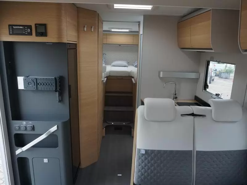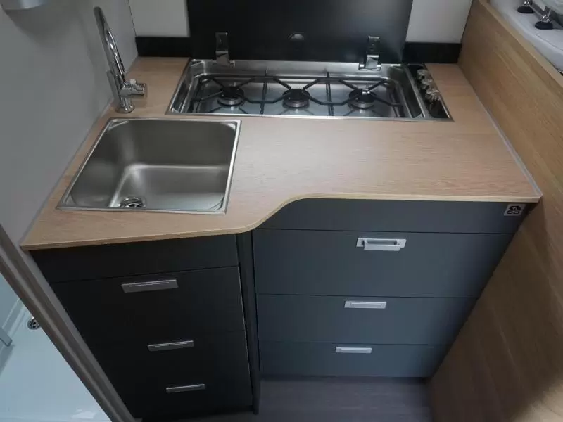 Door de ruime en comfortabele L-zit nodigt de camper uit voor gezellige avonden. De keuken is in het midden van de camper geplaatst en beschikt over een 3-pits kooktoestel en gootsteen met kraan. Er is een boiler aanwezig, die u van warm water voorziet. De inbouwkoelkast met vriescompartiment heeft een grote inhoud.