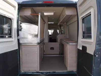 De handige standaardzit biedt niet alleen de nodige ruimte om te zitten, maar kan ook als slaapgelegenheid worden gebruikt. De keuken is in het midden van de camper gemonteerd. Voor een snelle toevoer van warm water is er een boiler aanwezig.