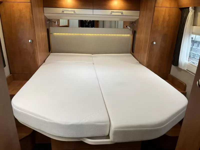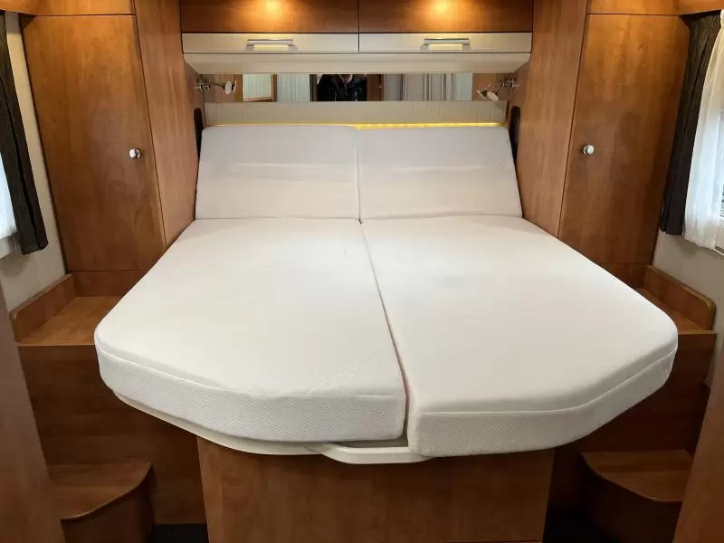 Het riante vrijstaande queensbed biedt een slaapgelegenheid aan 2 personen. Deze camper beschikt over een badkamer. Hierin bevindt zich een wastafel en ingebouwd cassettetoilet. Naast het slaapgedeelte bevindt zich ook de douchegelegenheid.