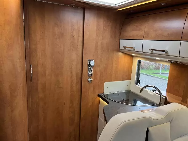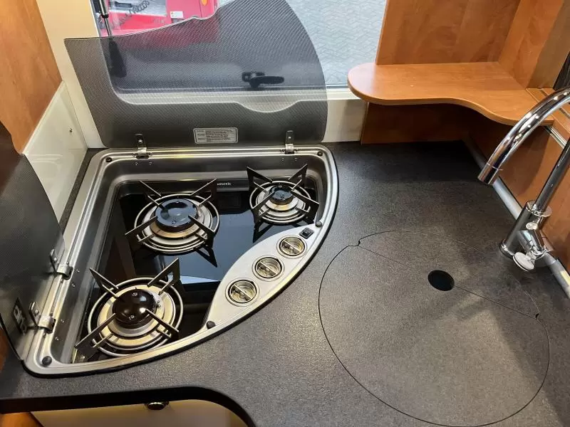 De uitnodigende L-zit is een prima plek om gezellig te eten en te drinken. Centraal in de camper bevindt zich de middenkeuken, uitgerust met een spoelbak, kraan en 3-pits kooktoestel. Een ingebouwde boiler voorziet u van warm water. De inbouwkoelkast met vriescompartiment heeft een grote inhoud.