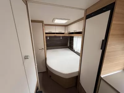 De caravan is uitgerust met een Frans bed, een in de lengte geplaatst tweepersoons bed. Het dwars geplaatste stapelbed is ideaal doordat het extra slaapplaatsen toevoegt zonder veel ruimte in beslag te nemen. U kunt zich heerlijk opfrissen bij de wastafel in de badkamer, waar tevens een cassettetoilet ingebouwd.