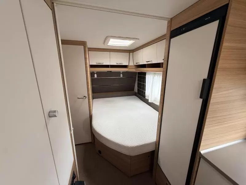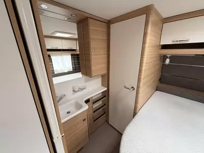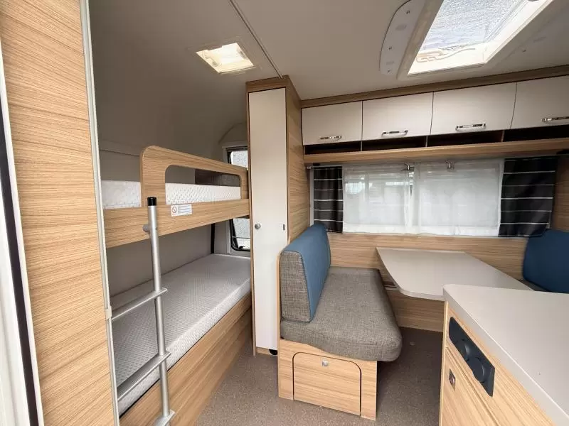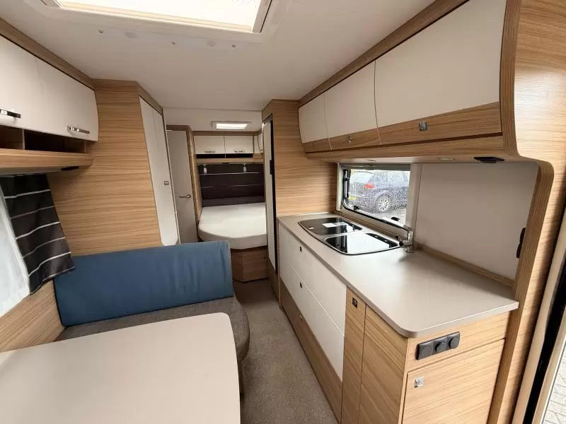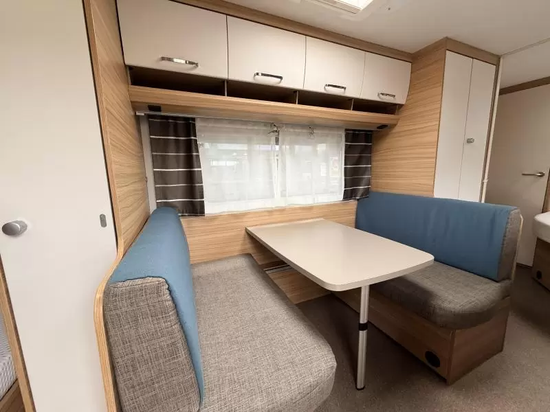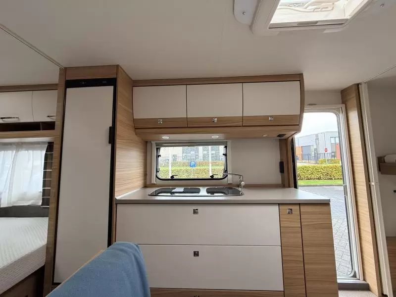 De uitnodigende middendinette is de ideale plek om samen te eten en te drinken. Door de praktische standaardzit, die eenvoudig tot bed kan worden omgebouwd, heeft u de nodige zit- en slaapgelegenheid. Centraal in de caravan bevindt zich de middenkeuken, uitgerust met een spoelbak, kraan en 3-pits kooktoestel. De apothekerskast in de keuken is handig om de kleine spullen in op te bergen. Een ingebouwde boiler voorziet u van warm water. De koelkast met vriescompartiment is ruim genoeg voor al uw etenswaren. De keukenbenodigdheden vinden een plekje in de ladekast.