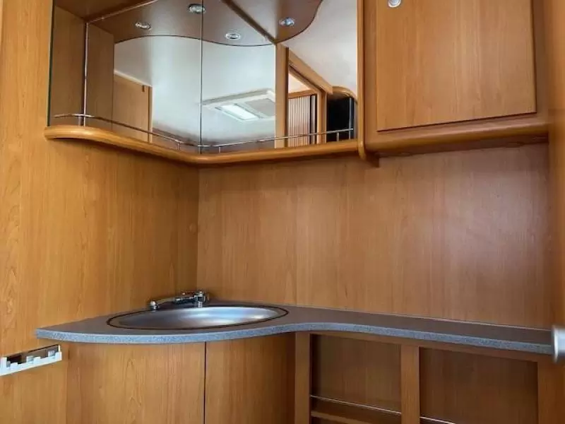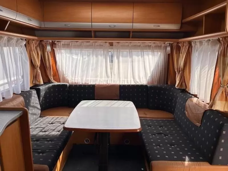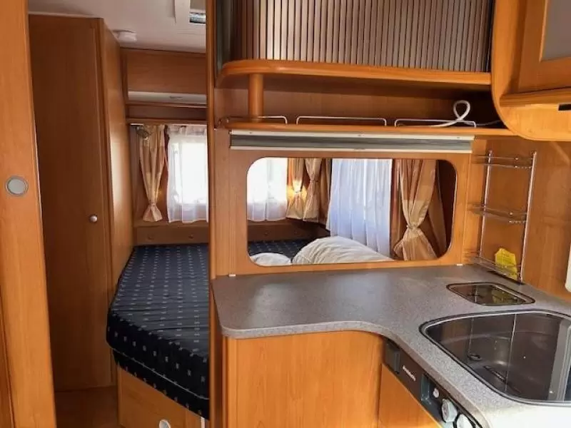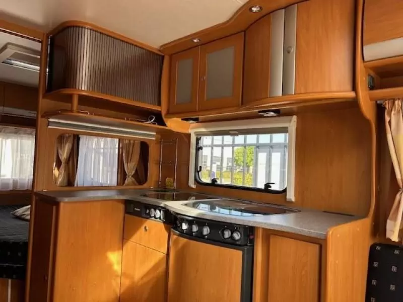 In de praktische rondzit waarmee de caravan is uitgerust, kunt u genieten van heerlijke maaltijden en gezellige avonden. De caravan beschikt over een middenkeuken met voldoende bergruimte, die praktisch is ingericht en met een 3-pits kooktoestel, spoelbak en kraan is uitgevoerd. Voor een snelle toevoer van warm water is er een 5 liter boiler aanwezig. De ingebouwde koelkast (89 liter) met vriesvak is uitgevoerd in een ruime uitvoering. De keukenbenodigdheden vinden een plekje in de ladekast.