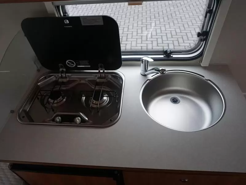 Verder beschikt de caravan over een kleine zit, die een prettige plek om rustig te lezen, te spelen of wat te drinken biedt. De ingebouwde koelkast (81 liter) met vriesvak is uitgevoerd in een ruime uitvoering.