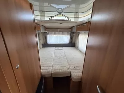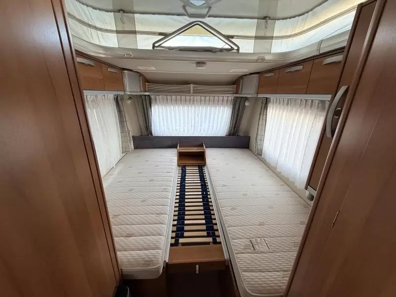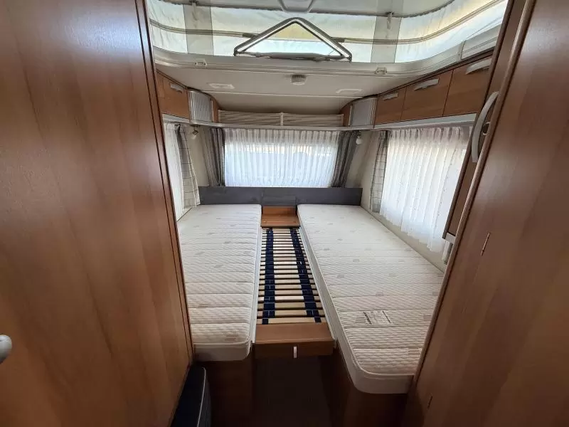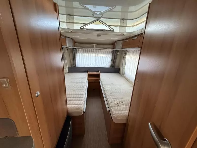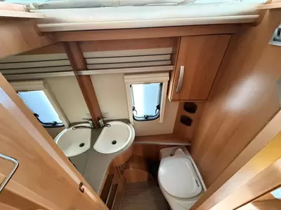 Slapen doet u op de 2 aparte bedden, die borg staan voor extra ruimte en een makkelijke instap. In de comfortabele badkamer van deze caravan vindt u behalve een wastafel ook een ingebouwd cassettetoilet.