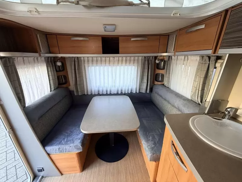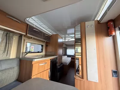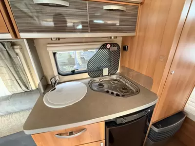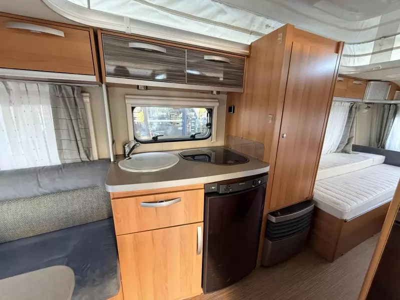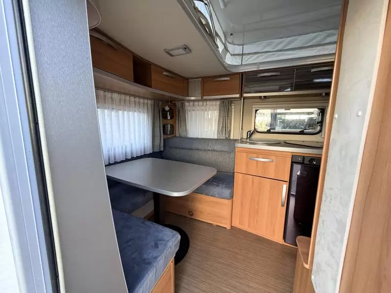 De ruime rondzit, waar deze caravan over beschikt, kan ook als slaapgelegenheid worden gebruikt. De keuken is in het midden van de caravan gemonteerd. De ingebouwde koelkast met vriesvak is uitgevoerd in een ruime uitvoering. De praktische ladekast is een handige plek voor de keukenbenodigdheden.
