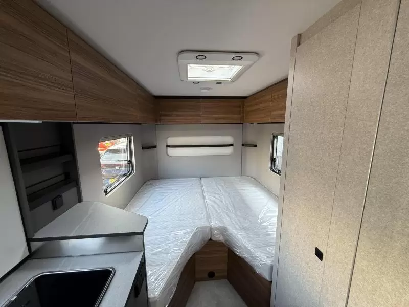 Het in de lengte van de caravan geplaatste bed biedt voldoende ruimte voor 2 personen. De badkamer biedt wasgelegenheid in de vorm van een wastafel. Ook is er een ingebouwd cassettetoilet.