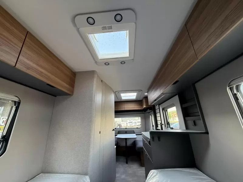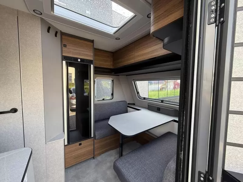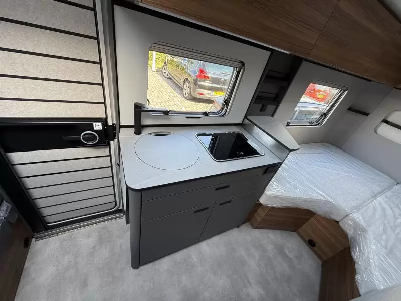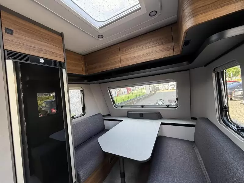 Door de standaardzit voor en achter heeft u veel zitruimte. U kunt zelf bepalen welke u ombouwt tot slaapgelegenheid. De keuken is in het midden van de caravan geplaatst en beschikt over een 2-pits kooktoestel en gootsteen met kraan. Er is een warmwatervoorziening in de vorm van een boiler aanwezig. De koelkast (133 liter) met vriescompartiment is ruim genoeg voor al uw etenswaren. De praktische ladekast is een handige plek voor de keukenbenodigdheden.