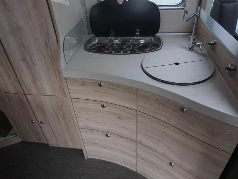 In de praktische, sfeervolle L-zit kunt u gezellig met elkaar eten en drinken. De complete keuken is in het midden van de camper geplaatst. Er is een boiler aanwezig, die u van warm water voorziet. De koelkast met vriesvak biedt voldoende ruimte voor heel uw voorraad.
