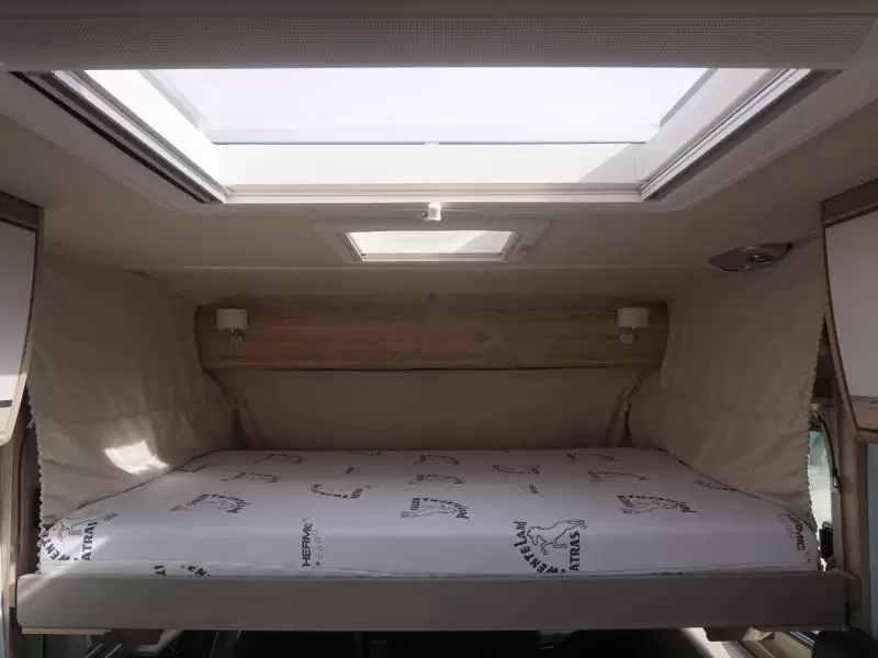 De camper is uitgerust met een Frans bed, een in de lengte geplaatst tweepersoons bed. Het hefbed bespaart enorm veel ruimte en biedt plaats aan 2 personen. In de badkamer, waar deze camper over beschikt, vindt u een ingebouwd cassettetoilet en een wastafel.