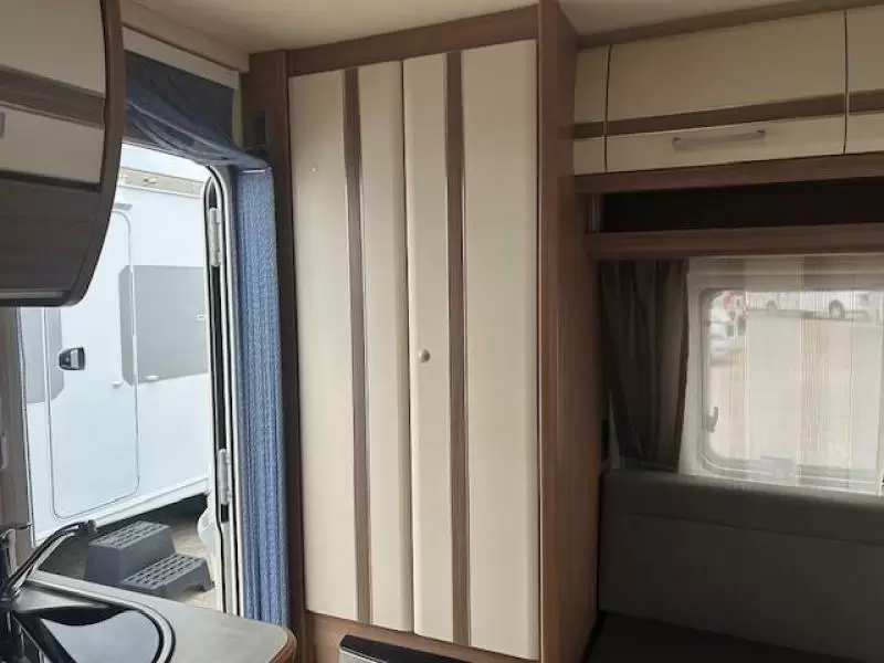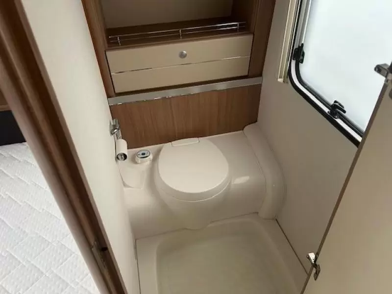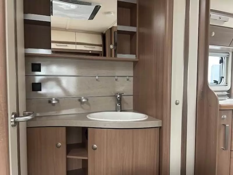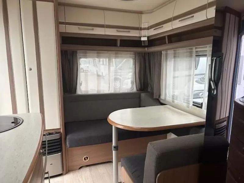 De treinzit vormt niet alleen een gezellige plek om te zitten, maar is ook een extra slaapgelegenheid. De caravan beschikt over een middenkeuken met voldoende bergruimte, die praktisch is ingericht en met een 3-pits kooktoestel, spoelbak en kraan is uitgevoerd. De boiler, die in de caravan is ingebouwd, voorziet u snel van warm water. Om uw etenswaren op te bergen is er een koelkast met vriescompartiment ingebouwd.