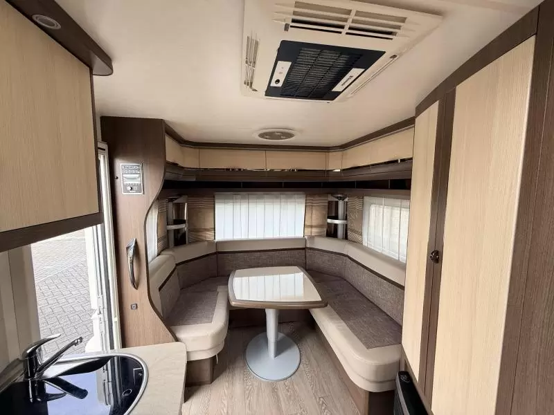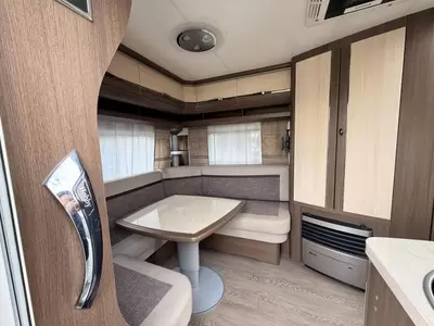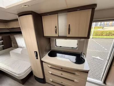 De gezellige en handige rondzit waar de caravan over beschikt, kan ook dienen als slaapgelegenheid. De ruime keuken is in het midden van de caravan geplaatst. Geheel compleet uitgevoerd, met onder meer een 3-pits kooktoestel, gootsteen met kraan en voldoende bergruimte. De boiler, die in de caravan is ingebouwd, voorziet u snel van warm water. De koelkast met vriesvak biedt voldoende ruimte voor heel uw voorraad.
