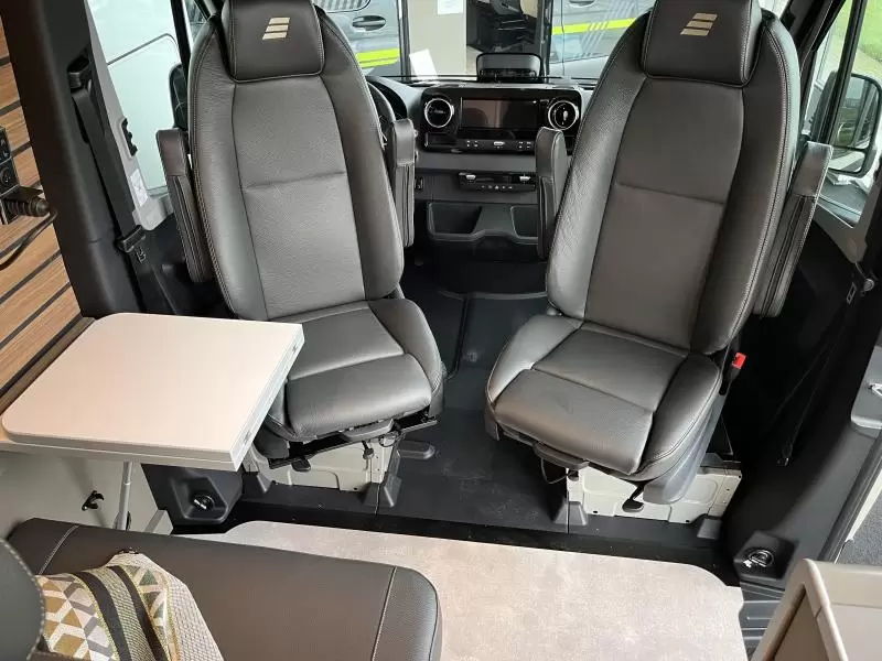 Een prima gelegenheid om gezellig te eten of nieuwe plannen te maken wordt gevormd door de halve treinzit. Centraal in de camper bevindt zich de middenkeuken, uitgerust met een spoelbak, kraan en 2-pits kooktoestel. Er is een warmwatervoorziening in de vorm van een boiler aanwezig. De koelkast (90 liter) met vriescompartiment is ruim genoeg voor al uw etenswaren.