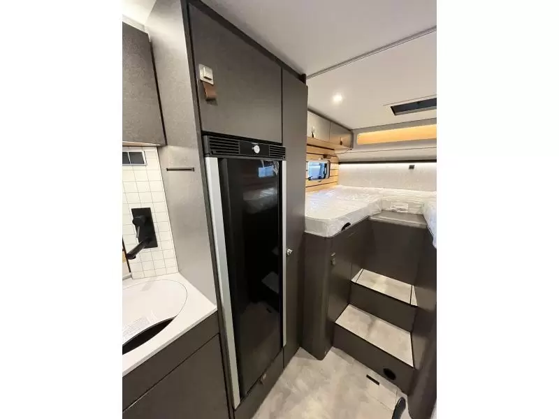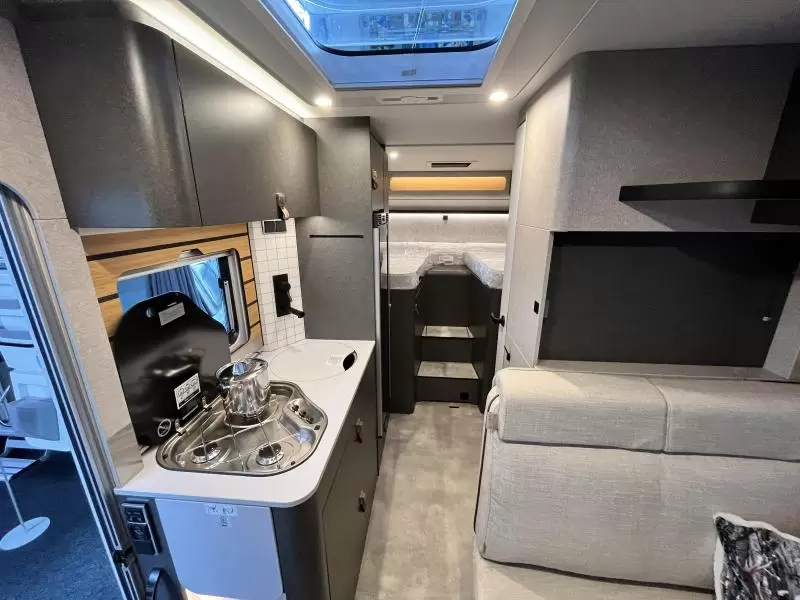 De complete keuken is in het midden van de camper geplaatst. Voor een snelle toevoer van warm water is er een boiler aanwezig. De ingebouwde koelkast met vriesvak is uitgevoerd in een ruime uitvoering.