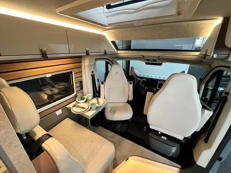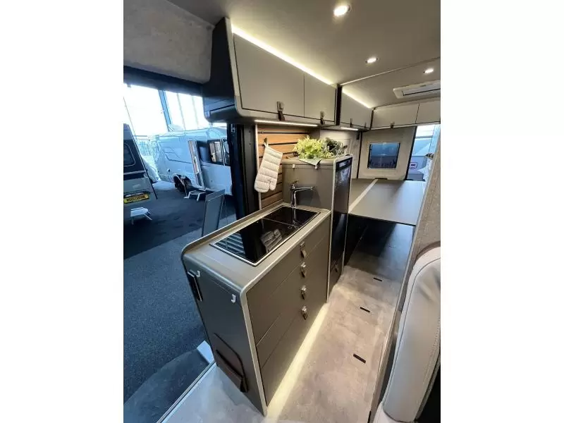 De camper heeft een kleine zit, een prettige gelegenheid om rustig te lezen, te spelen of wat te drinken. Centraal in de camper bevindt zich de complete middenkeuken. De boiler, die in de camper is ingebouwd, voorziet u snel van warm water. Om uw etenswaren op te bergen is er een koelkast met vriescompartiment ingebouwd.