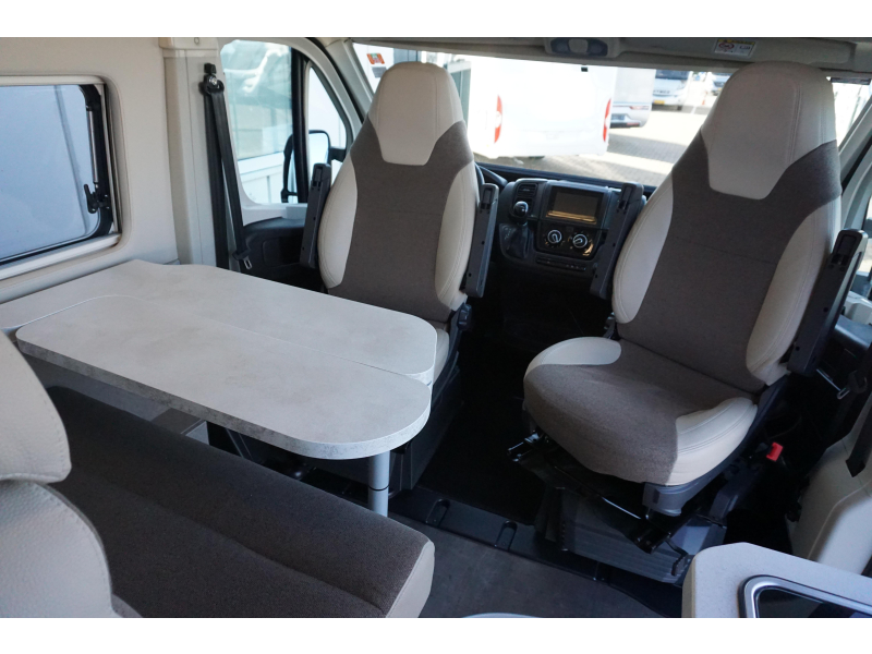 Om gezellig samen te kunnen zitten, eten en drinken is de camper voorzien van een praktische standaardzit. De complete keuken is in het midden van de camper geplaatst. Een ingebouwde boiler voorziet u van warm water. Om uw etenswaren op te bergen is er een koelkast met vriescompartiment ingebouwd.