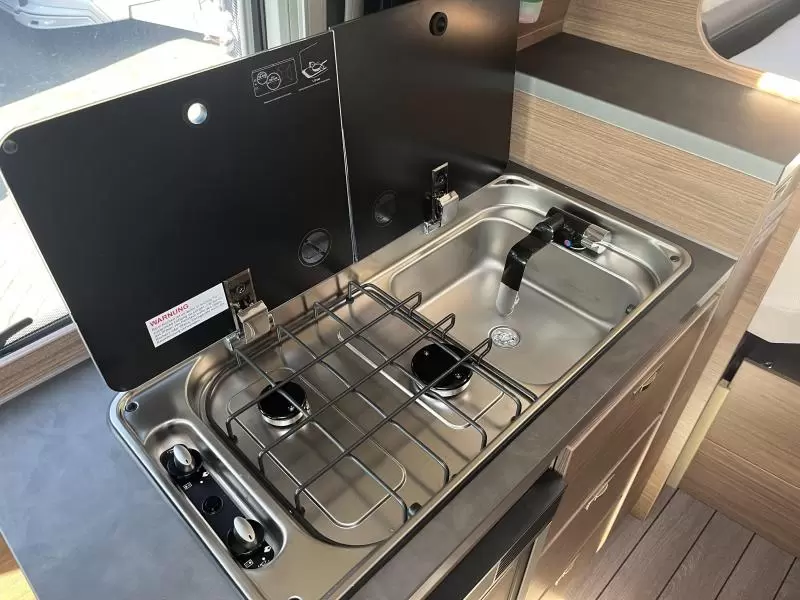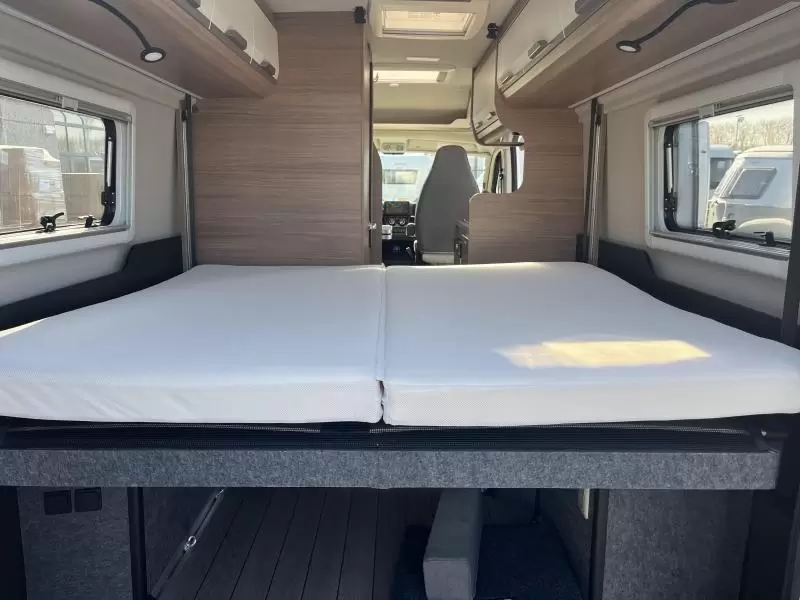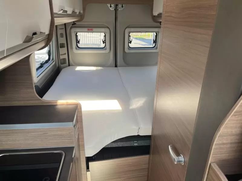 In de camper vindt u onder meer een ruim tweepersoons bed dat in de lengte is geplaatst. Een handige ruimtewinner is het tweepersoons hefbed, dat zich boven de zitgroep bevindt. U kunt zich heerlijk opfrissen bij de wastafel in de badkamer. Daar is ook een cassettetoilet ingebouwd. In de camper kunt u ook douchen. Er bevindt zich een doucheruimte naast het slaapgedeelte.