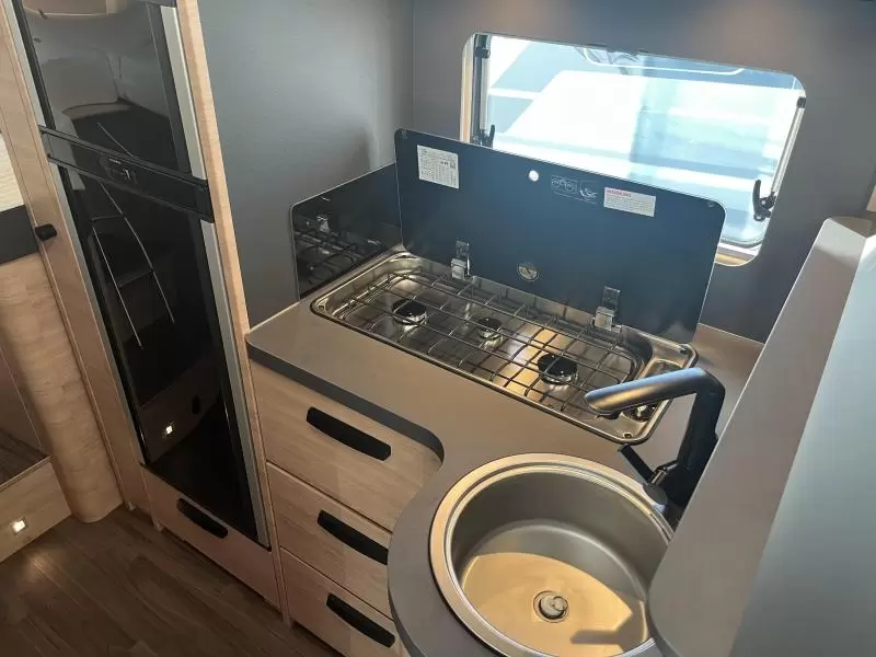 Het kleine zitje, waar de camper over beschikt, biedt een heerlijke plaats om even rustig te spelen, te internetten of te drinken. De uitnodigende L-zit is een prima plek om gezellig te eten en te drinken. Het keukenblok is centraal in de camper gemonteerd en is onder anderen uitgerust met 3-pits gascomfoor, spoelbak en kraan. Voor een snelle toevoer van warm water is er een boiler aanwezig. De inbouwkoelkast met vriescompartiment heeft een grote inhoud.