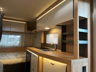Een extra slaapgelegenheid wordt gevormd door de comfortabele, gezellige treinzit. Het keukenblok, dat centraal in de caravan is gemonteerd, heeft voldoende bergruimte en is uitgerust met een 3-pits gascomfoor, spoelbak en kraan. Een ingebouwde boiler voorziet u van warm water. De koelkast met vriesvak biedt voldoende ruimte voor heel uw voorraad.