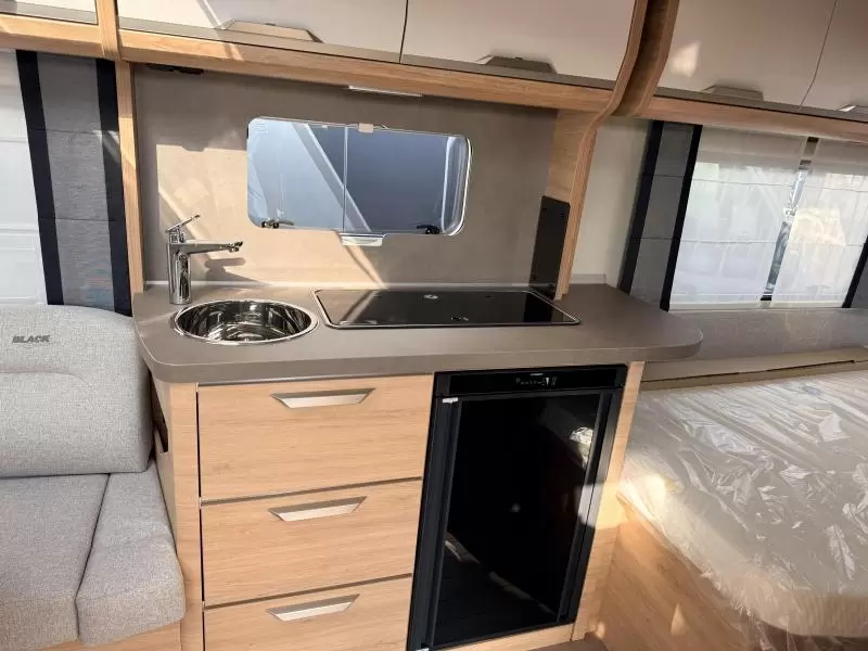 In de praktische rondzit waarmee de caravan is uitgerust, kunt u genieten van heerlijke maaltijden en gezellige avonden. De middenkeuken, waar de caravan over beschikt, is onder meer voorzien van een 3-pits kooktoestel, spoelbak en kraan. De boiler, die in de caravan is ingebouwd, voorziet u snel van warm water. De koelkast met vriescompartiment is ruim genoeg voor al uw etenswaren.