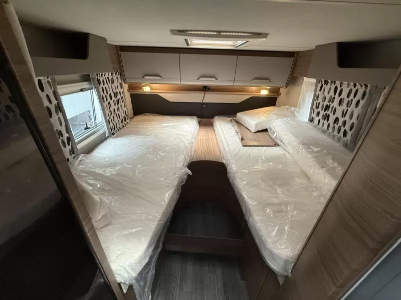 De twee aparte bedden waarover de camper beschikt, bieden een gemakkelijke instap. Aan slaapcomfort zal het u in deze camper, die is voorzien van lattenbodems en traagschuimmatrassen, zeker niet ontbreken. In de badkamer vindt u een wastafel om u op te frissen, alsmede een ingebouwd cassettetoilet. Naast het slaapgedeelte bevindt zich ook de douchegelegenheid.