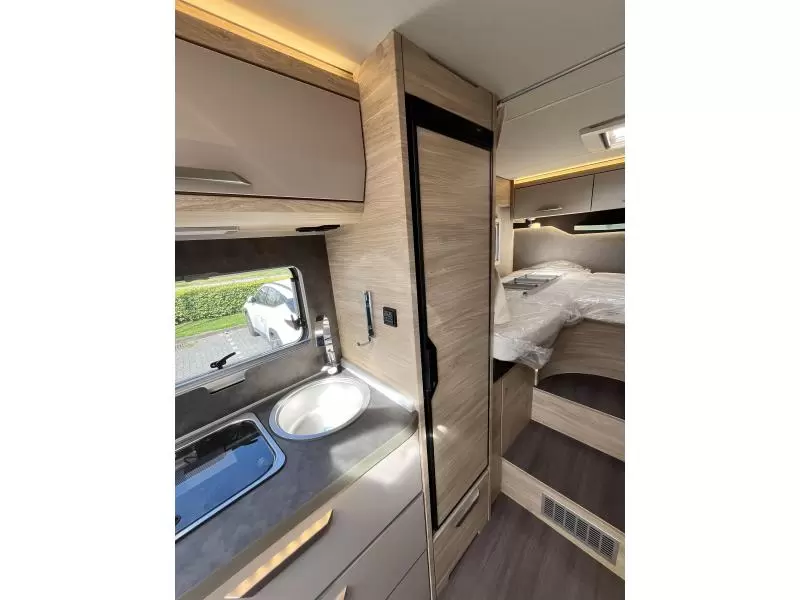 De handige standaardzit biedt niet alleen de nodige ruimte om te zitten, maar kan ook als slaapgelegenheid worden gebruikt. De keuken is in het midden van de camper gemonteerd. Er is een boiler aanwezig, die u van warm water voorziet.