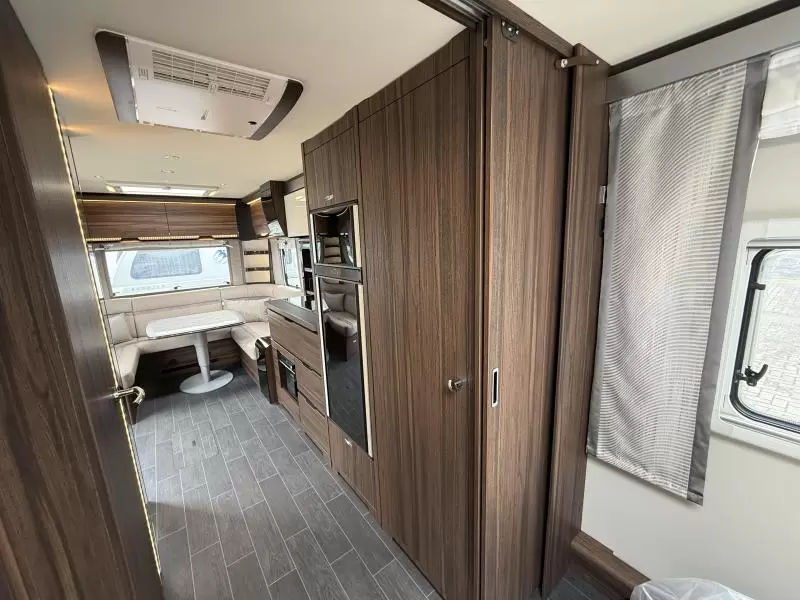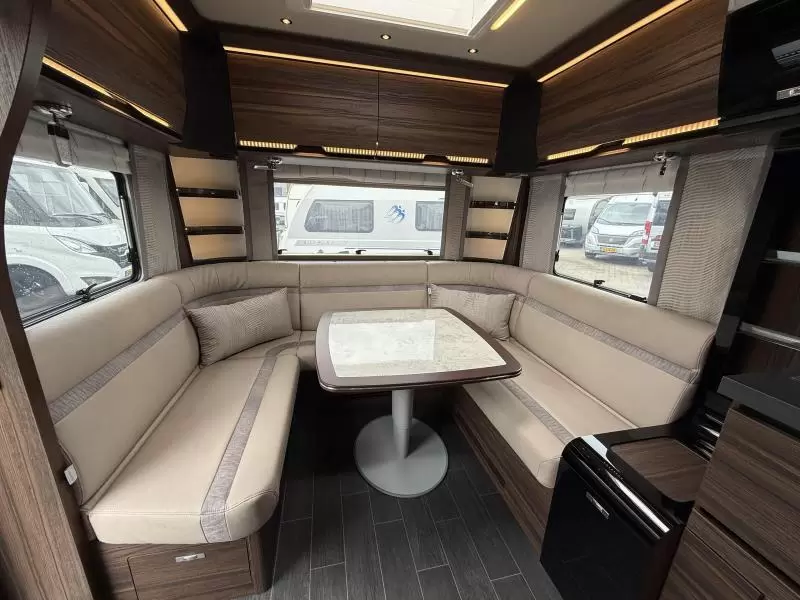 De caravan heeft een gezellige rondzit die u eenvoudig kunt ombouwen tot comfortabele slaapplaats. Centraal in de caravan bevindt zich de praktisch ingedeelde en ruime middenkeuken, welke geheel compleet is uitgerust met een spoelbak, kraan en 3-pits kooktoestel. De apothekerskast in de keuken is handig om de kleine spullen in op te bergen. Voor een snelle toevoer van warm water is er een boiler aanwezig. Om al uw etenswaren op te bergen is er een extra ruime XL koelkast (177 liter) met vriescompartiment ingebouwd. Alle keukenbenodigdheden kunnen worden opgeborgen in de ladekast.