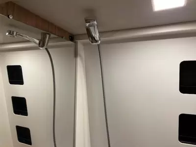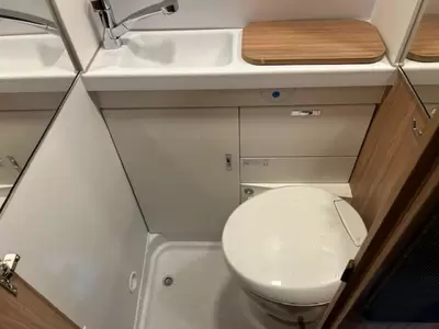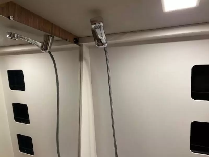 In de de badkamer vindt u niet alleen een wastafel maar ook een ingebouwd cassettetoilet. In de camper kunt u ook douchen. Er bevindt zich een doucheruimte naast het slaapgedeelte.