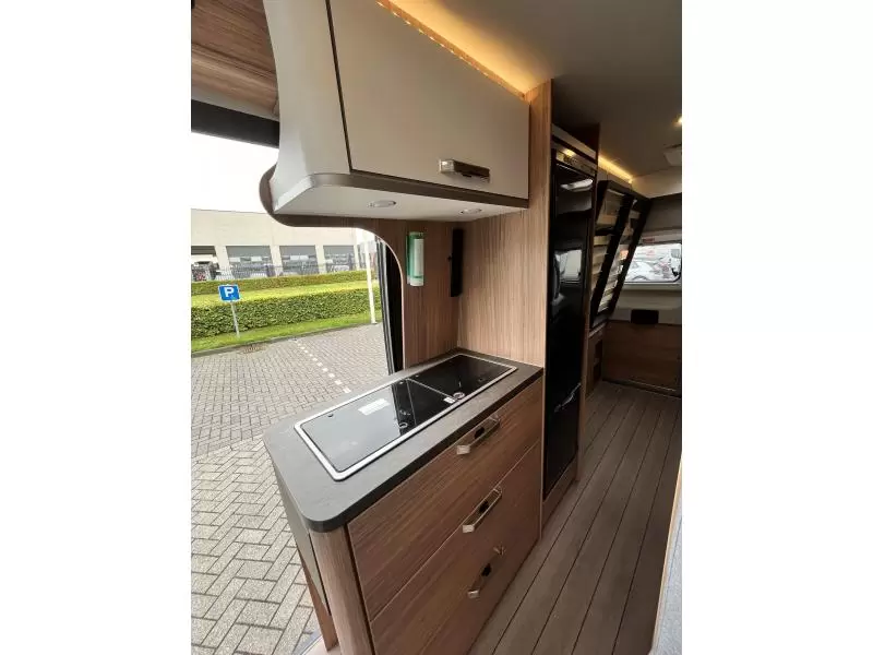 Een gezellige plek om te zitten vindt u in de centrale halve treinzit, deze kan uiteraard ook dienen als extra slaapplaats. De complete keuken is in het midden van de camper geplaatst. Voor een snelle toevoer van warm water is er een boiler aanwezig. De extra grote koelkast (150 liter) met vriescompartiment is ruim genoeg voor al uw etenswaren.