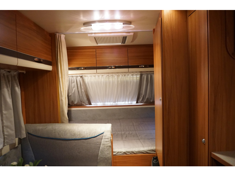 De caravan beschikt over een ruim, tweepersoons bed dat dwars is geplaatst. Deze caravan beschikt over een badkamer. Hierin bevindt zich een wastafel en ingebouwd cassettetoilet.