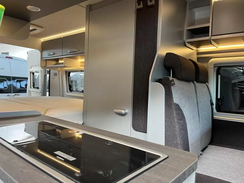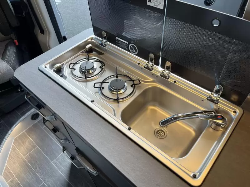 Een prima gelegenheid om gezellig te eten of nieuwe plannen te maken wordt gevormd door de halve treinzit. Centraal in de camper bevindt zich de middenkeuken, uitgerust met een spoelbak, kraan en 2-pits kooktoestel. Er is een warmwatervoorziening in de vorm van een boiler aanwezig. Om uw etenswaren op te bergen is er een koelkast met vriescompartiment ingebouwd.