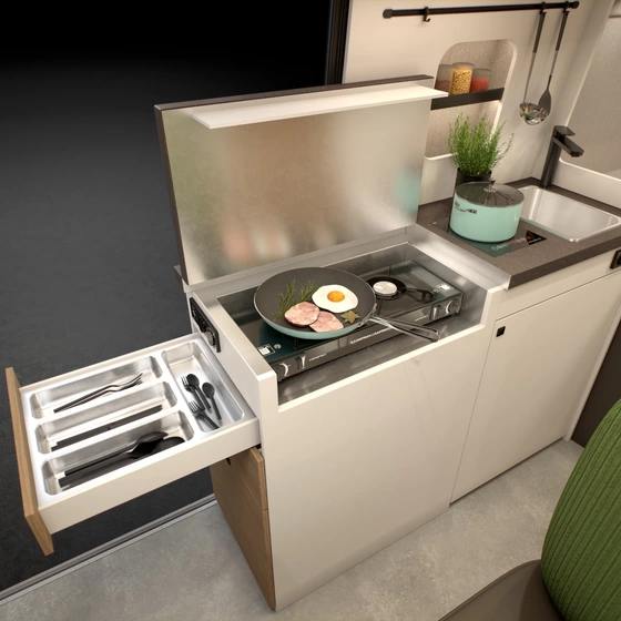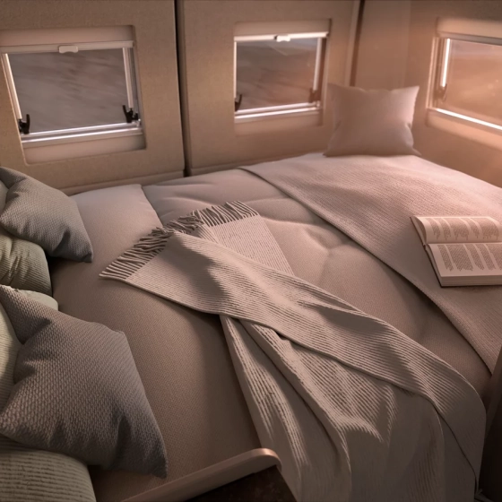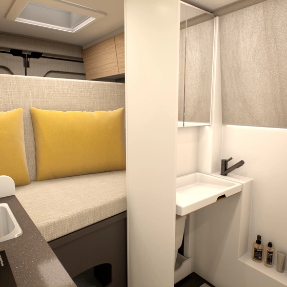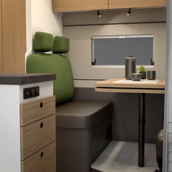 Binnen vind je een interieur dat zorgvuldig is opgezet voor slimme ruimtebeleving, moderne keuken en een badkamer die verrast – zodat je ook onderweg het gevoel van thuis ervaart.