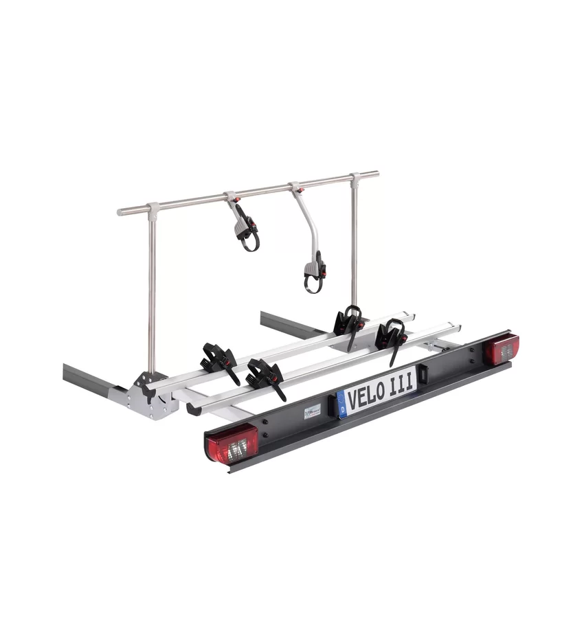 De VELO III kan eenvoudig omhoog of omlaag geklapt worden dankzij de hendels op de verlichtingsbalk. Zo neemt de drager minimale ruimte in, terwijl hij permanent gemonteerd kan blijven op de camper. Perfect voor wie regelmatig met e-bikes reist, maar geen ruimte wil verliezen.